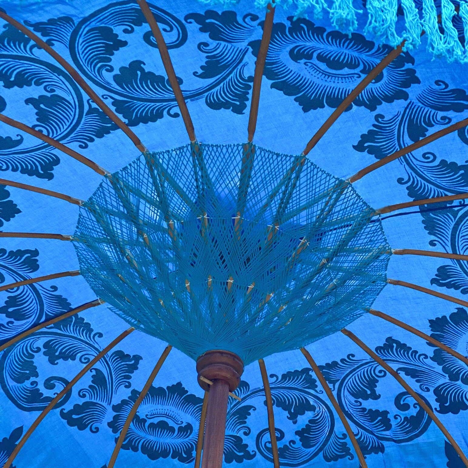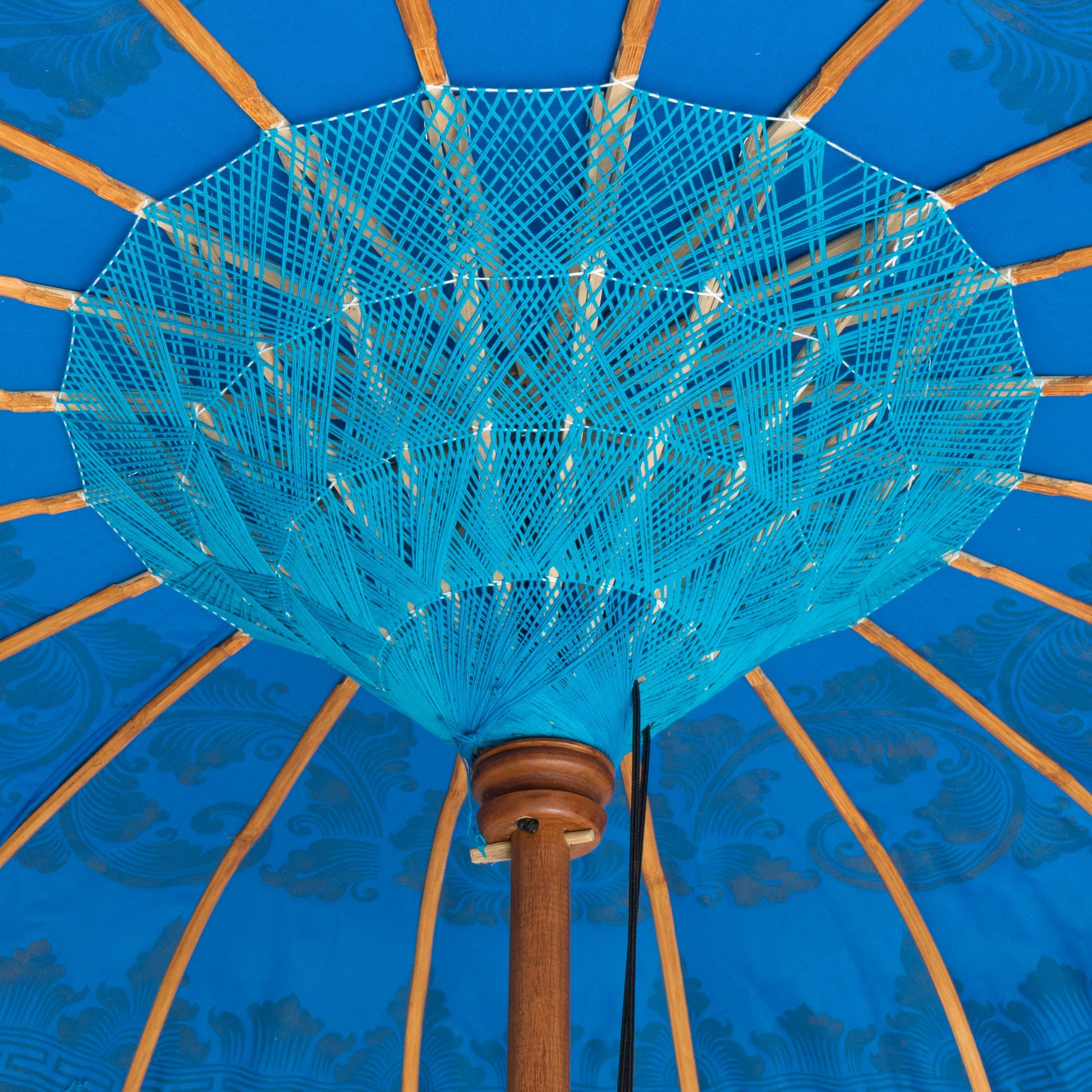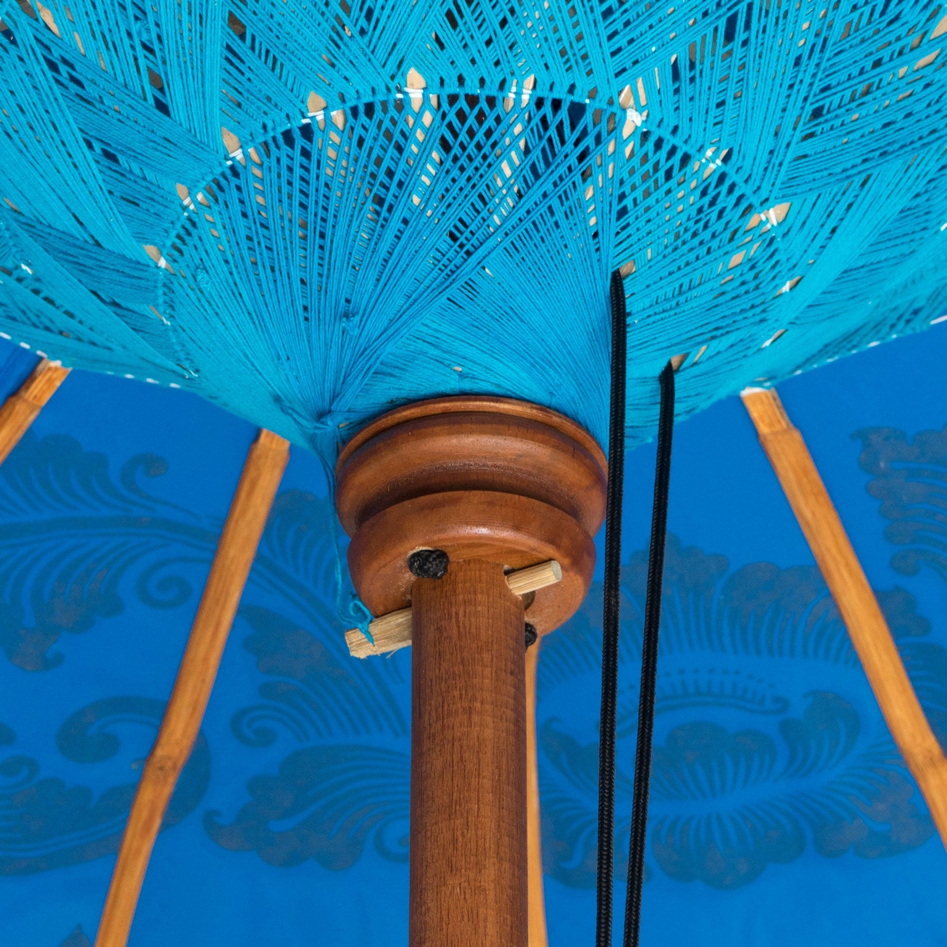 - Includes handmade parasol cloth and hand-carved wooden parasol pole.