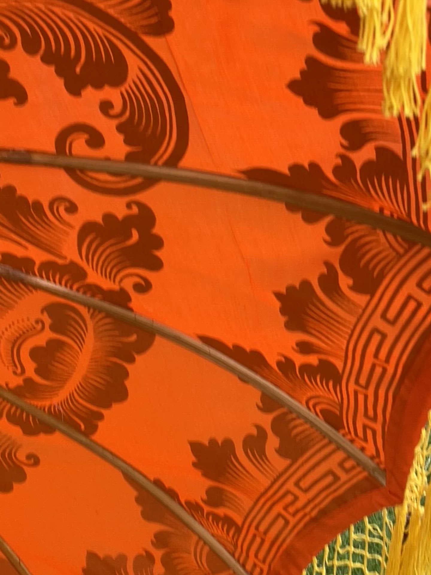 - Includes handmade parasol cloth and hand-carved wooden parasol pole.